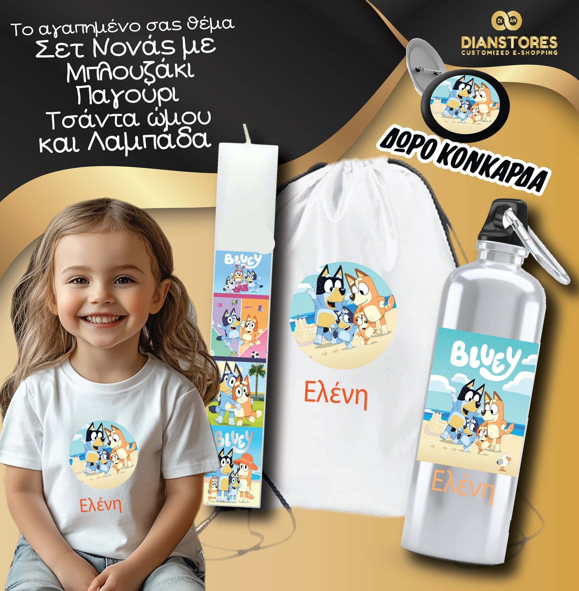 Σετ Λαμπάδα , Παγούρι & Τσάντα & σακίδιο πλάτης γυμναστικής & Tshirt με εκτύπωση τον Bluey